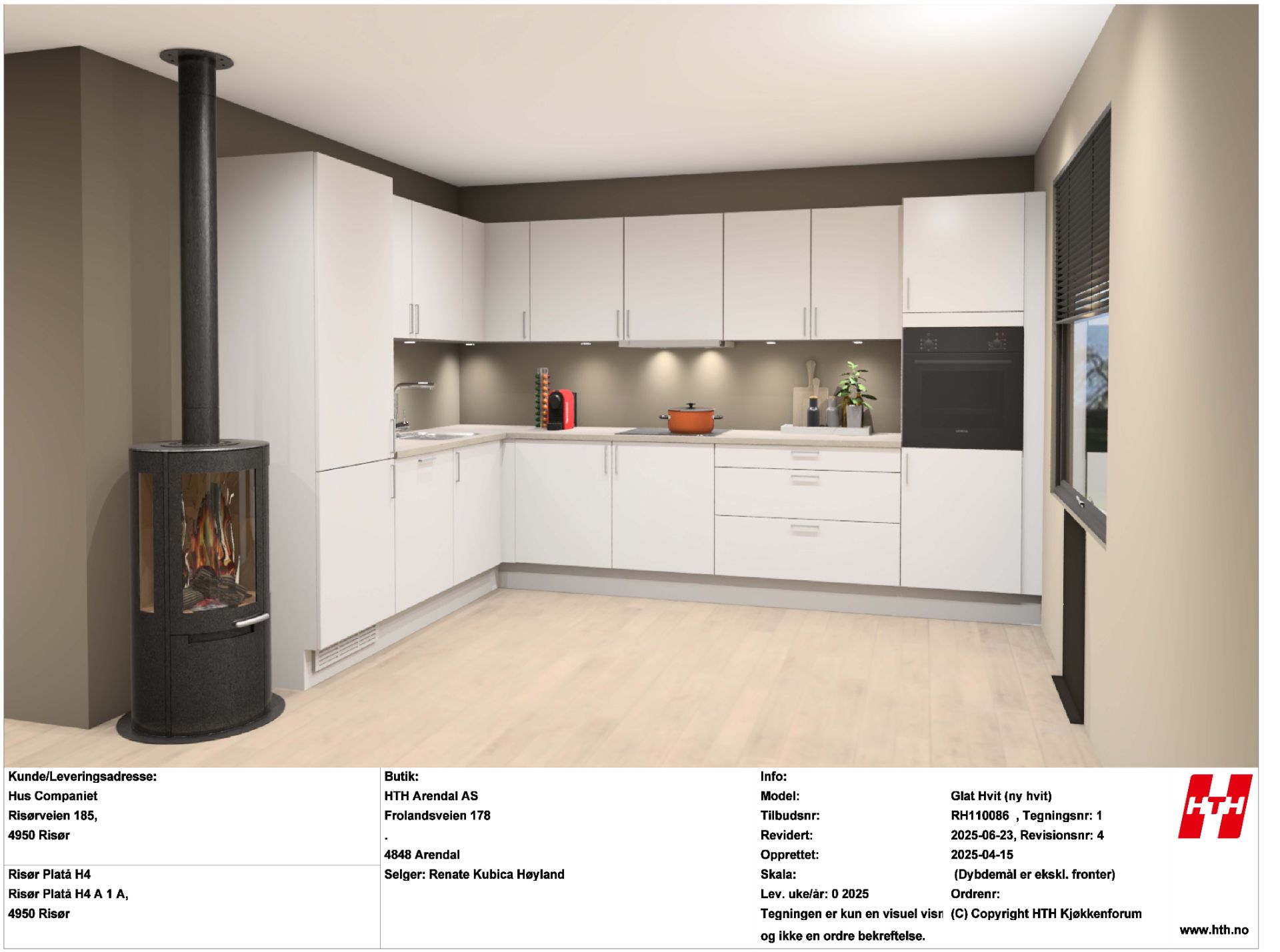 Kjøkken er fra HTH, modell Stockholm, som har fire standard farger å velge mellom på frontene. Klargjort for integrerte hvitvarer. Det er også tegnet ett forslag fra HTH med kjøkkenøy.